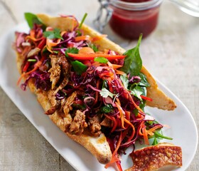 U kunt deze verse baguettes vullen met wat u maar wilt – langzaam geroosterd BBQ varkensvlees, rodekoolsalade en chili-jam is bijzonder lekker.