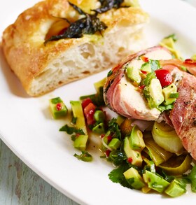 Focaccia is overheerlijk op zich, lichtjes gedipt in olie. Of probeer uw focaccia ook met in pancetta gewikkelde kip, afgewerkt met avocado salsa?