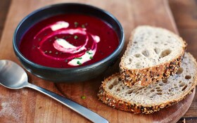 Uw brood met zaden vormt een perfecte aanvulling op de diepe, rijke smaak van geroosterde rode bietensoep.
